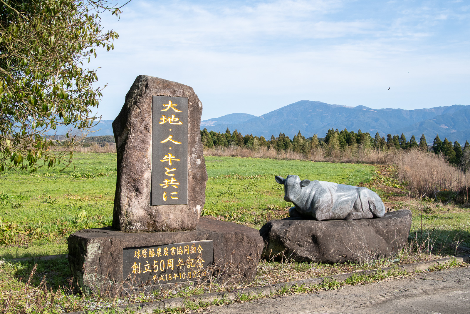 球磨酪農の敷地にある創立記念碑。「大地・人・牛と共に」という決意が刻まれている。
