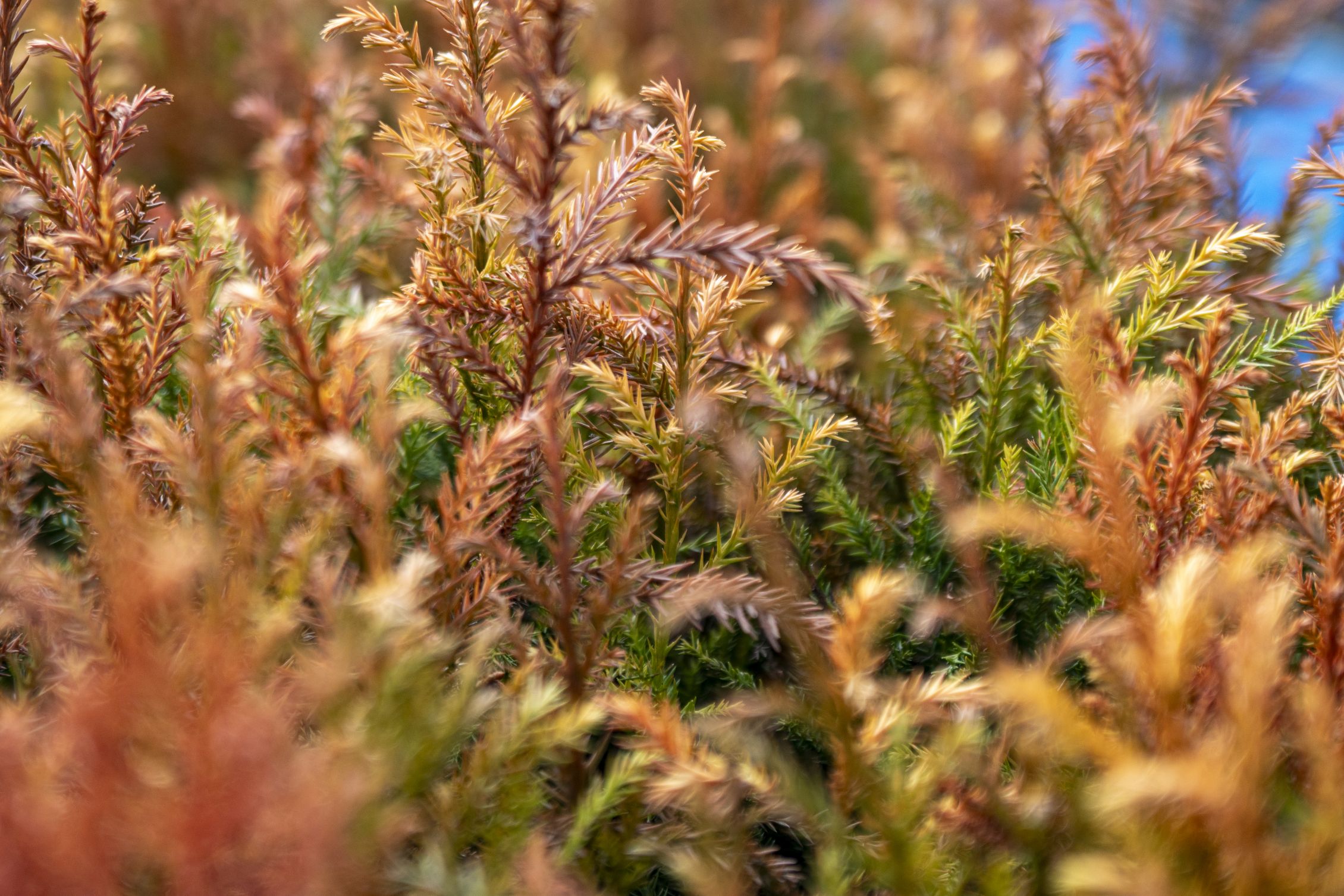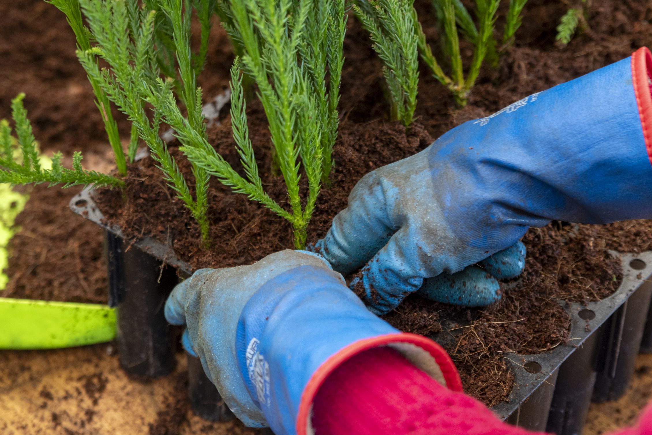 スギの苗木。穂先が赤いのは紅葉によるもの。春になると一気に緑色になり、出荷のときを迎える。