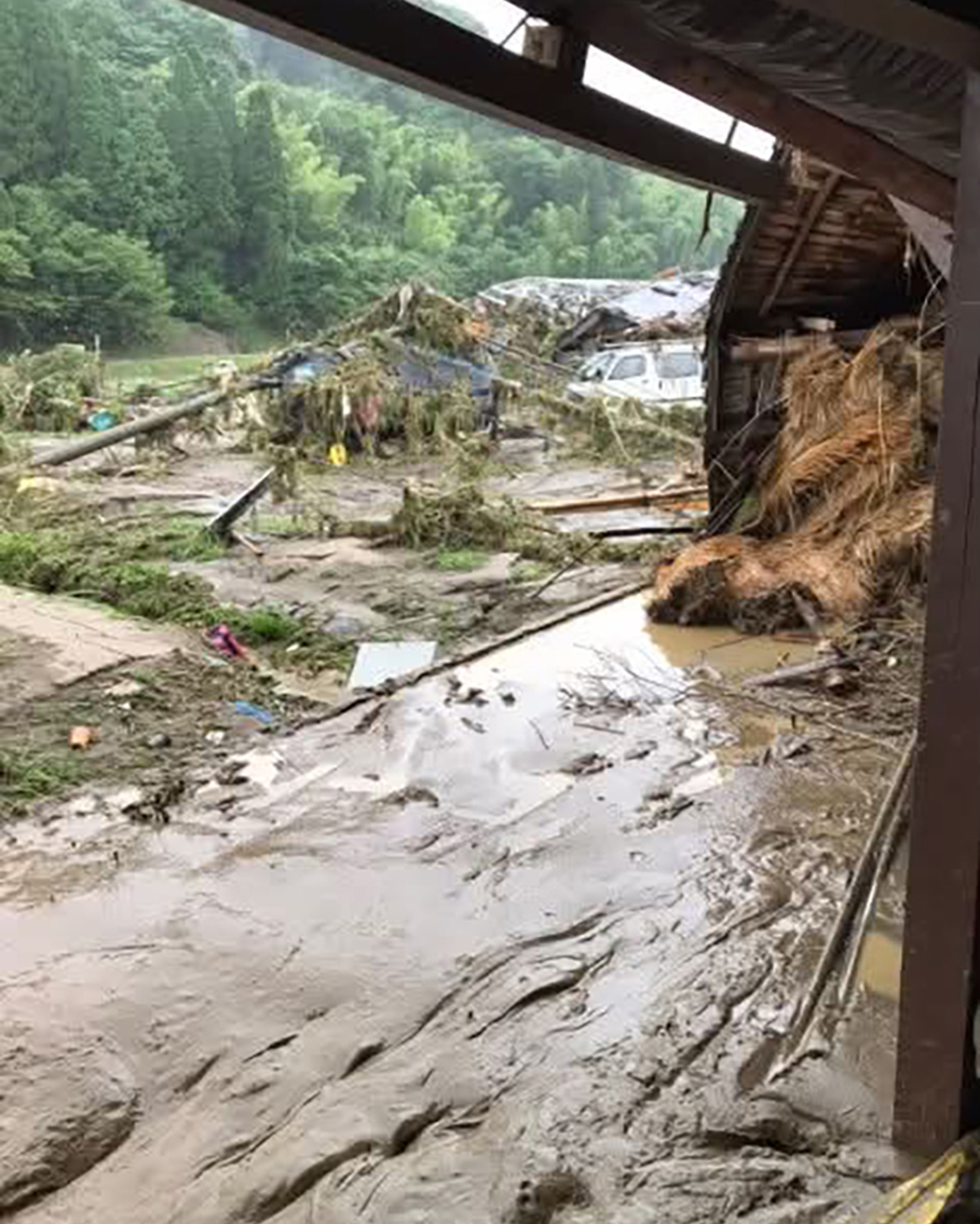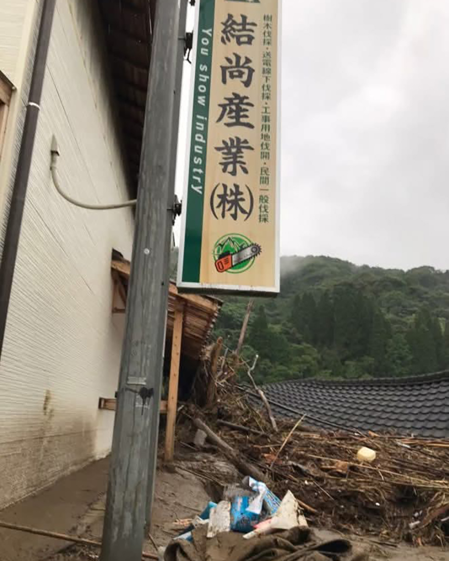 会社の敷地には濁流とともに大量の土砂と流木が押し寄せ、壊滅的な被害となった。