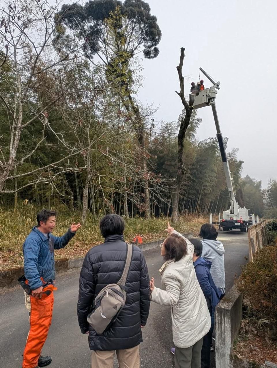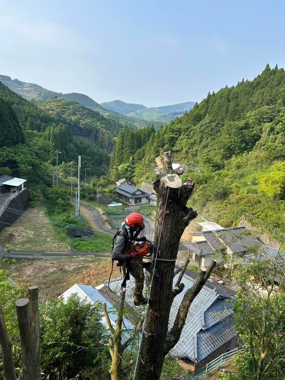特殊伐採の一例。民家のすぐ近くの木や、道路に面した木を切っている。